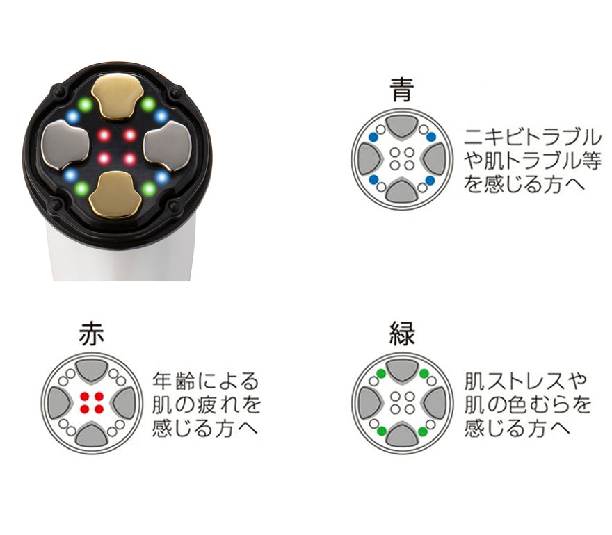 赤・緑・青の光の波長が、肌悩みをケアしながら美容成分の浸透*を促進します。 *角質層まで